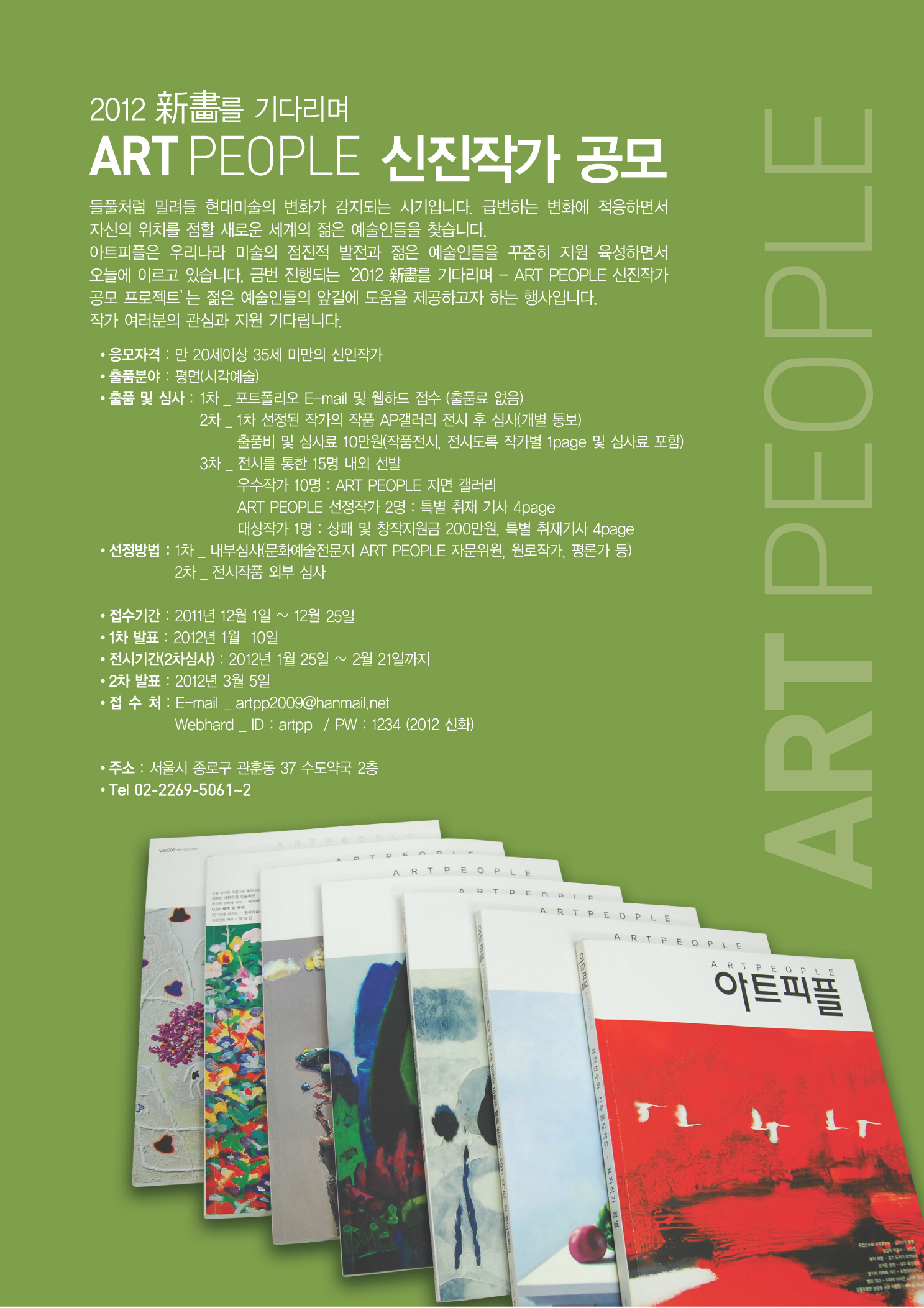 <2012 新畵를 기다리며> - ART PEOPLE 신진작가 공모 들풀처럼 밀려들 현대미술의 변화가 감지되는 시기입니다. 급변하는 변화에 적응하면서 자신의 위치를 점할 새로운 세계의 젊은 예술인들을 찾습니다. 아트피플은 우리나라 미술의 점진적 발전과 젊은 예술인들을 꾸준히 지원 육성하면서 오늘에 이르고 있습니다. 금번 진행되는 2012 新畵를 기다리며 - ART PEOPLE 신진작가 공모 프로젝트는 젊은 예술인들의 앞길에 도움을 제공하고자 하는 행사입니다. 작가 여러분의 관심과 지원 기다립니다. 응모자격 : 만 20세 이상 신인작가 출품분야 : 평면(시각예술) 출품 및 심사 : 1차 : 포트폴리오 E-mail 및 웹하드 접수 (출품료 없음) 2차 : 1차 선정된 작가의 작품 AP갤러리 전시 후 심사(개별 통보) 출품비 및 심사료 10만원(작품전시, 전시도록 작가별 1page 및 심사료 포함) 3차 : 전시를 통한 15명 내외 선발 우수작가 10명 : ART PEOPLE 지면 갤러리 ART PEOPLE 선정작가 2명 : 특별 취재 기사 4page 대상작가 1명 : 상패 및 창작지원금 200만원, 특별 취재 기사 4page 선정방법 : 1차 내부심사(문화예술전문지 ART PEOPLE 자문위원, 원로작가, 평론가 등) 2차 전시작품 외부 심사 접수 기간 : 2011년 12월 1일 ~ 12월 25일 1차 발 표 : 2012년 1월 10일 전시기간(2차 심사) : 2012년 1월 25일 ~ 2월 21일까지 2차 발 표 : 2012년 3월 5일 접 수 처 : E-mail, artpp2009@hanmail.net Web hard: ID: artpp / PW: 1234 (2012 신화) 주 소 : 서울시 종로구 관훈동 37번지 수도약국 2층 전화번호 : 02 - 2269 - 5061 .2 www.artpp.co.kr