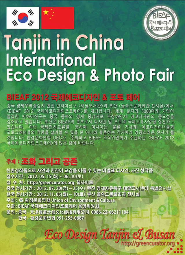 bieaf2012는 중국의 경제무역중심지 톈진빈하이신구 ‘태다도서관’과 을숙도 문화회관전시실에서 < 국제에코디자인포토페어> 를 개최합니다. 세계 굴지의 5000여개 기업이 밀집한 빈하이신구는 중국 동북의 경제중심지로 부상하면서 에코디자인의 중요성을 강조하고 있습니다.