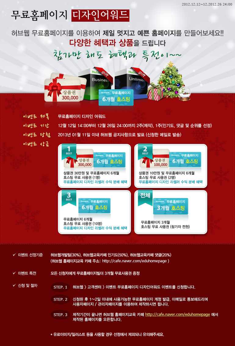 ▶ 이벤트상금 - 1위(상품권 30만원 및 무료홈페이지 6개월 호스팅 무료사용권)/1명,