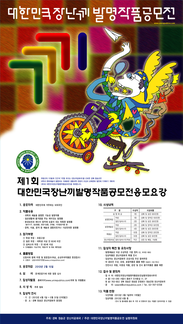 - ‘대한민국장난끼발명작품공모전’ 홈페이지 www.unirepublics.com 및 개별통보