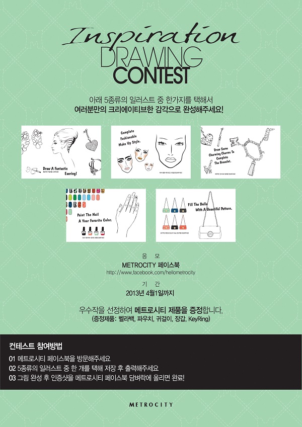 - 우수작(5명) : 메트로시티 제품(벨라백,귀걸이,파우치,장갑,Key ring) 증정