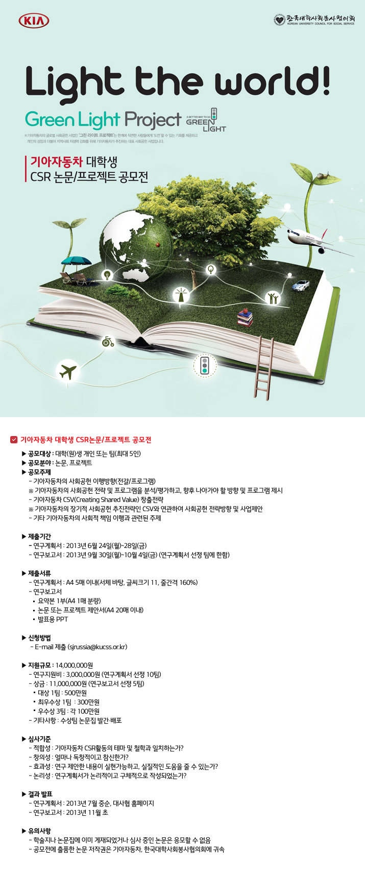 - 최근 기업의 사회적 책임에 대한 대학생들의 관심이 높아짐에 따라 기아자동차와 함께 CSR 논문/프로젝트 공모전을 시행하고자 하오니 많은 참여 부탁드립니다.