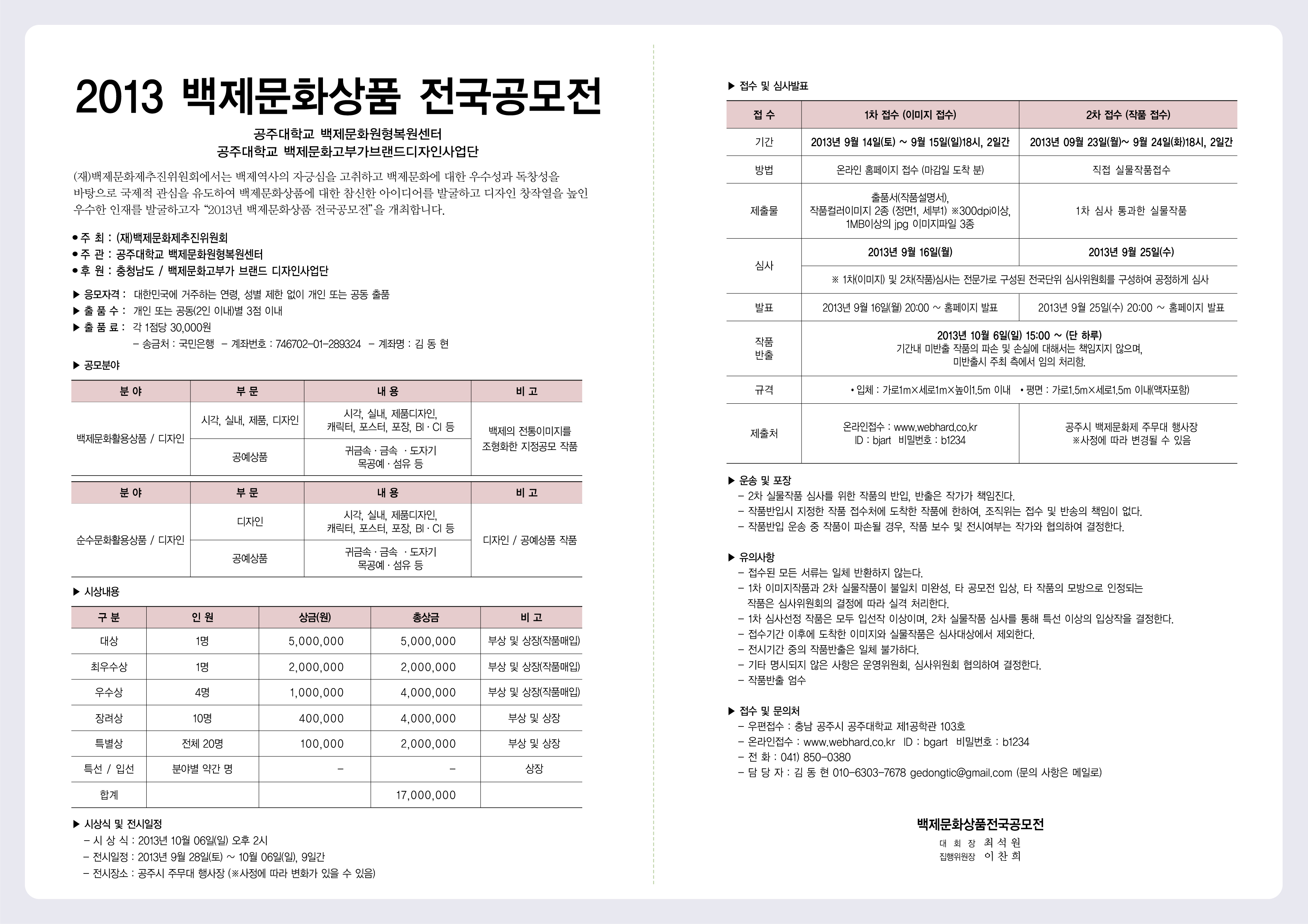 (재)백제문화제추진위원회에서는 백제역사의 자긍심을 고취하고 백제문화에 대한 우수성과 독창성을 바탕으로 국제적 관심을 유도하여 백제문화상품에 대한 참신한 아이디어를 발굴하고 디자인 창작열을 높인 우수한 인재를 발굴하고자 “2013년 백제문화상품 전국공모전”을 개최합니다.