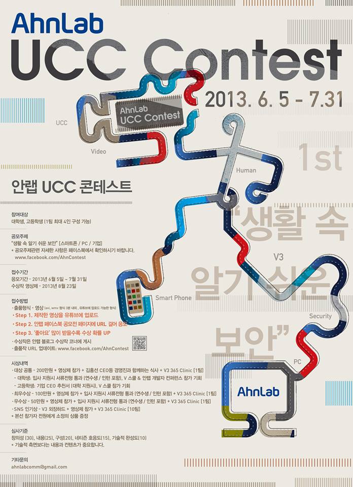 - 제작한 영상을 유트브에 업로드 후 안랩 페이스북(http://www.facebook.com/AhnContest/) 공모전 페이지에 URL 걸어 응모