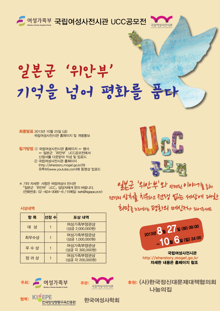 - 일본군 ‘위안부’관련 UCC를 통해 전쟁의 상처를 치유하고 전쟁 없는 세상에 대한 희망을 노래하는 평화의 메신저가 되어주세요!