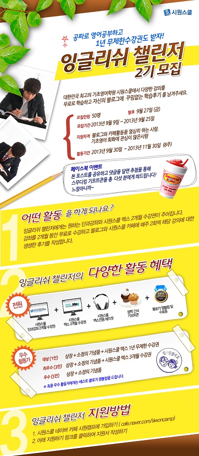 - 잉글리쉬 챌린저에게는 원하는 단과강좌와 시원스쿨 맥스 2개월 수강권이 주어집니다. 강좌를 2개월 동안 무료로 수강하고 블로그와 시원스쿨 카페에 매주 2회씩 해당 강의에 대한 생생한 후기를 작성합니다.