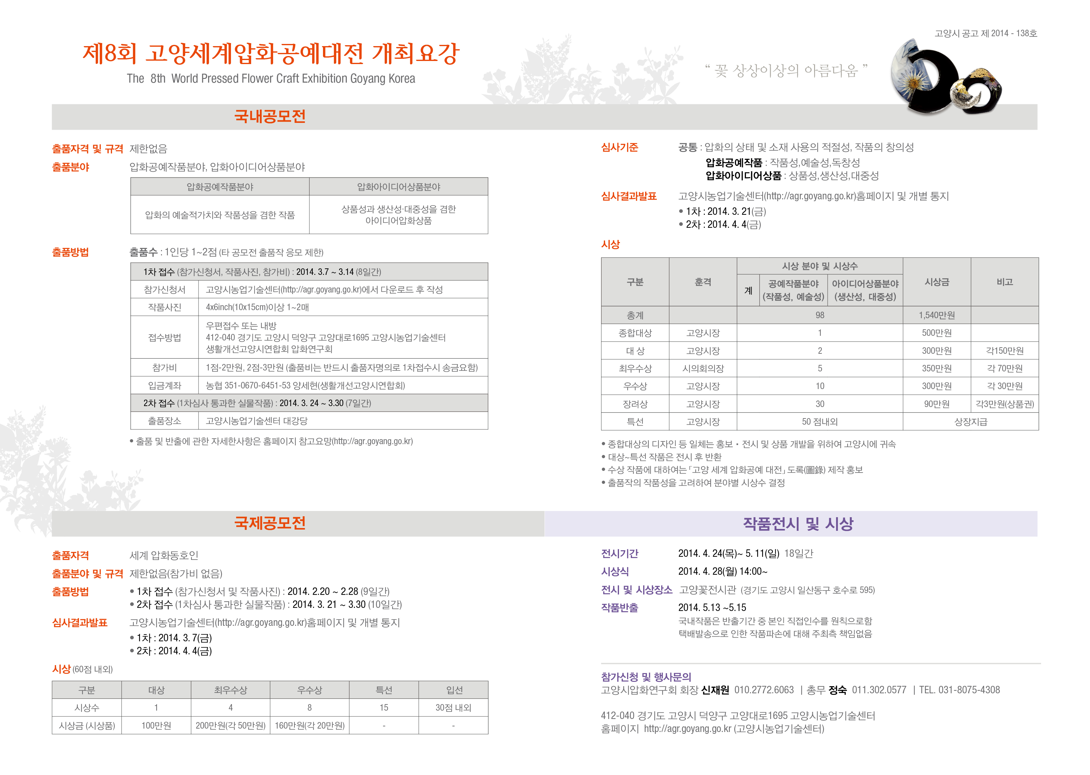 화훼가공산업의 발전을 도모코자 아래와 같이 제8회 고양세계압화공예대전를 개최하오니