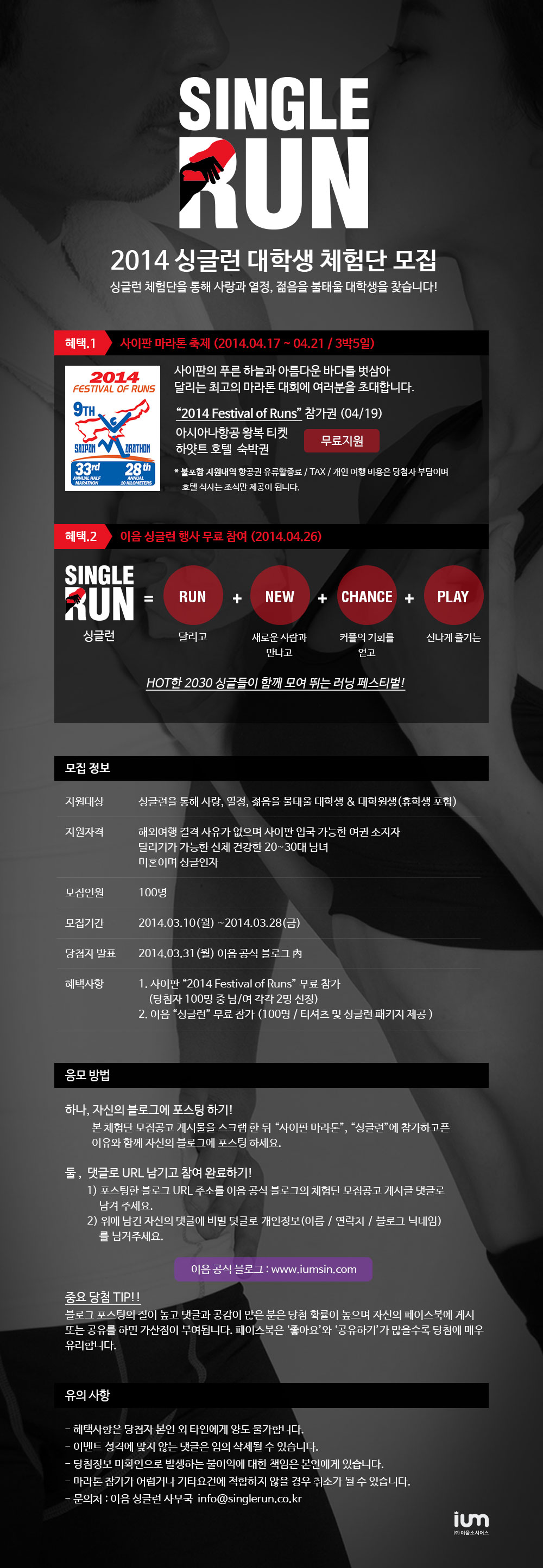 - 싱글런을 통해 사랑, 열정, 젊음을 불태울 대학생 & 대학원생(휴학생 포함)