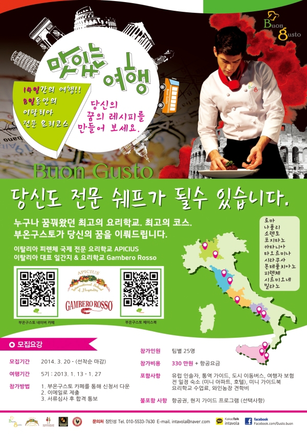 더욱 더 새롭고,강하게 무장한 부온구스토 5기 모집 이탈리아가 자랑하는 최고의 요리학교 국제전문요리학교 APICIUS 이탈리아 대표 일간지&요리학교 감베로로쏘(GAMBERO ROSSO) 이탈리아만의 자랑거리 몬테풀치아노 와이너리방문 및 와인 테스팅&와인 수업 파르마 치즈공장 or 발사믹 공장 견학 모두가 꿈꿔왔지만 가지못했던 그곳,지중해 최대의 섬 "시칠리아" 한 여름밤 남부의 꿈