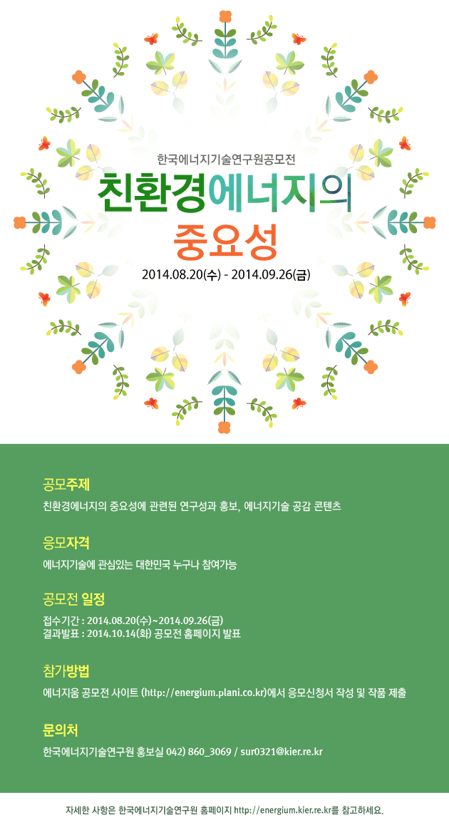 이번 공모전은 친환경에너지에 대한 인식을 높이고, 미래의 에너지에 대해 함께 고민하기 위해 개최합니다. 여러분의 많은 참여 바랍니다.