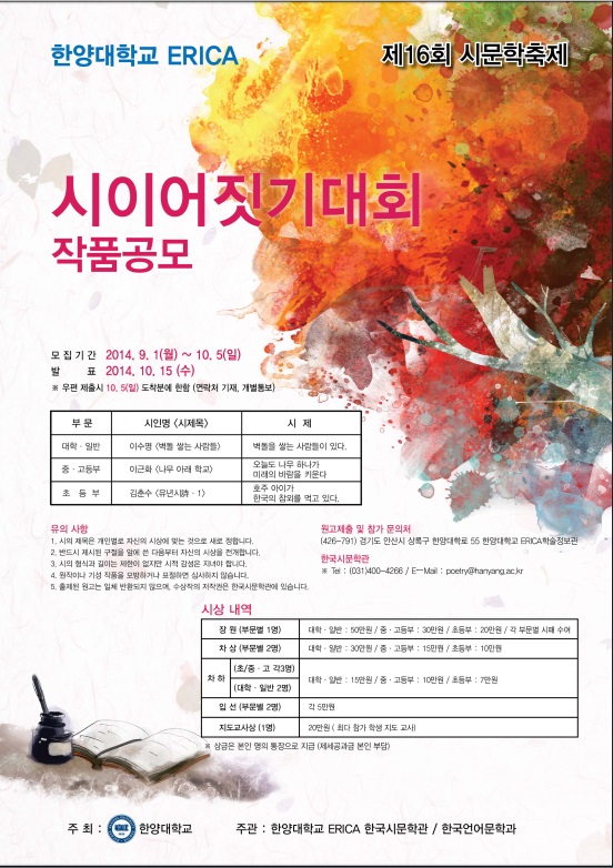한양대학교 ERICA학술정보관과 한국언어문학과에서는 제16회‘시문학축제’를 개최합니다.