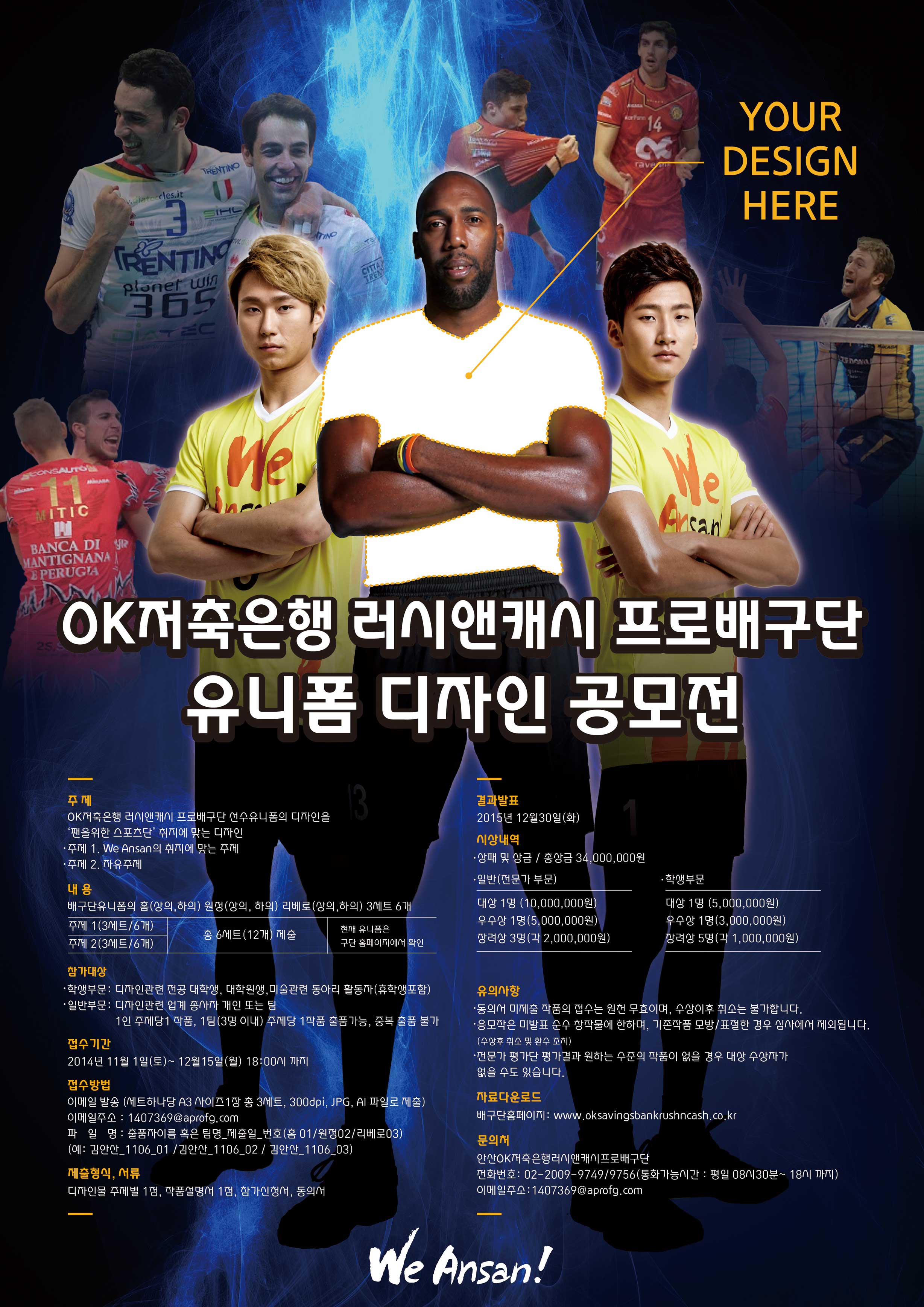 OK저축은행 러시앤캐시 프로배구단 유니폼 디자인 공모전 OK저축은행 러시앤캐시 프로배구단 선수 유니폰 디자인을 공모합니다.자세한 사항은 아래 첨부된 포스터를 참조해주세요.