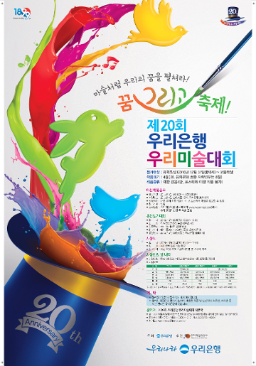 우리은행 우리미술대회는1995년부터 시작하여 올해 20회째 개최되는 전통 있는 미술대회로 그림을 통해 어린이와 청소년 여러분의 꿈을 새하얀 화폭 위에 자유롭게 펼쳐내는 축제입니다. 우리은행은 우리미술대회가 참가자 모두에게 소중한 추억을 간직할 수 있는 축제로 기억될 수 있도록 권위 있는 전문가의 심사를 거쳐 좋은 작품을 엄선하며, 수상한 어린이와 청소년에게는 문화체육관광부장관상을 비롯한 풍성한 상과 장학금을 수여하고 있습니다. 꼬마 화가들의 많은 관심과 참여 부탁 드립니다.