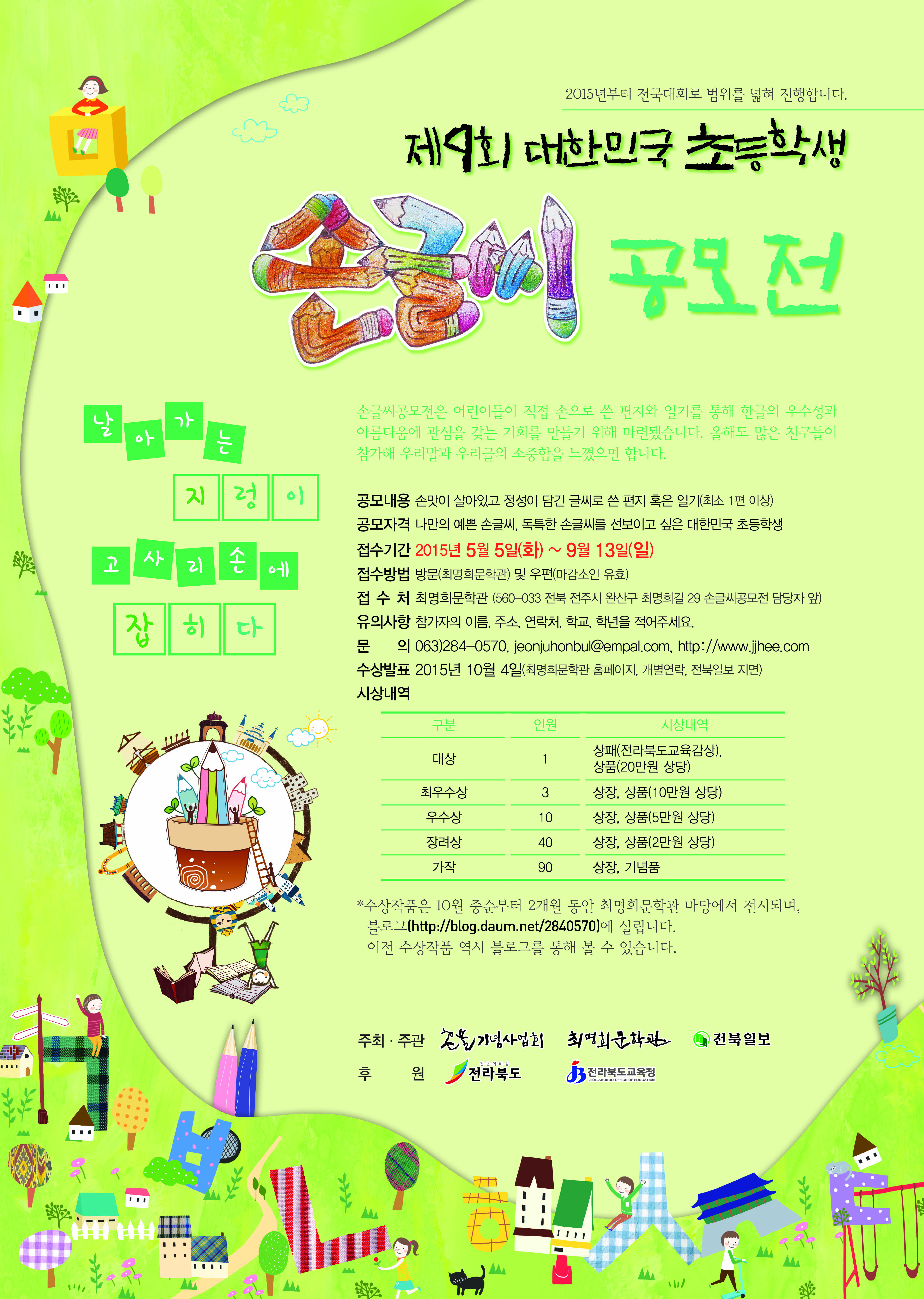 최명희문학관과 혼불기념사업회, 전북일보사가 주최·주관하여 2015년 < 제9회 대한민국 초등학생 손글씨 공모전> 을 개최합니다. 나만의 예쁜 손글씨, 독특한 손글씨를 선보이고 싶은 대한민국의 초등학생이라면 누구나 참여할 수 있습니다. 직접 손으로 쓴 편지와 일기를 통해 한글의 우수성과 아름다움과 우리말·우리글의 소중함을 느꼈으면 합니다.