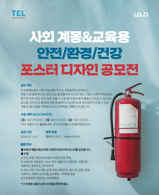 도쿄일렉트론의 기본 이념 중에 하나는 사회발전에 공헌하고, 경영 이념 중에 하나는 안전,건강,환경을 최우선으로 하는 기업의 사회적 책임으로, 정기적 이웃 성금, 태안 원유 유출 시 사원 봉사 참여 등의 활동도 이어오고 있으며, 앞으로, 안전,건강,환경에 대해 현실적이고 감성적으로 국민에게 다가갈 수 있는 계몽 및 봉사 활동 차원에서 포스터 제작을 진행하고자 합니다
