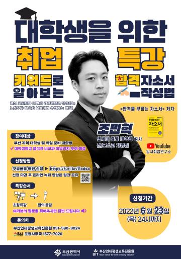 부산인재평생교육진흥원 / 2022 지역대학 대학생 역량 강화를 위한 대학생 무료 특강(~6/23목)[대학생을 위한 취업특강 : 키워드로 알아보는 합격 자소서 작성법]
