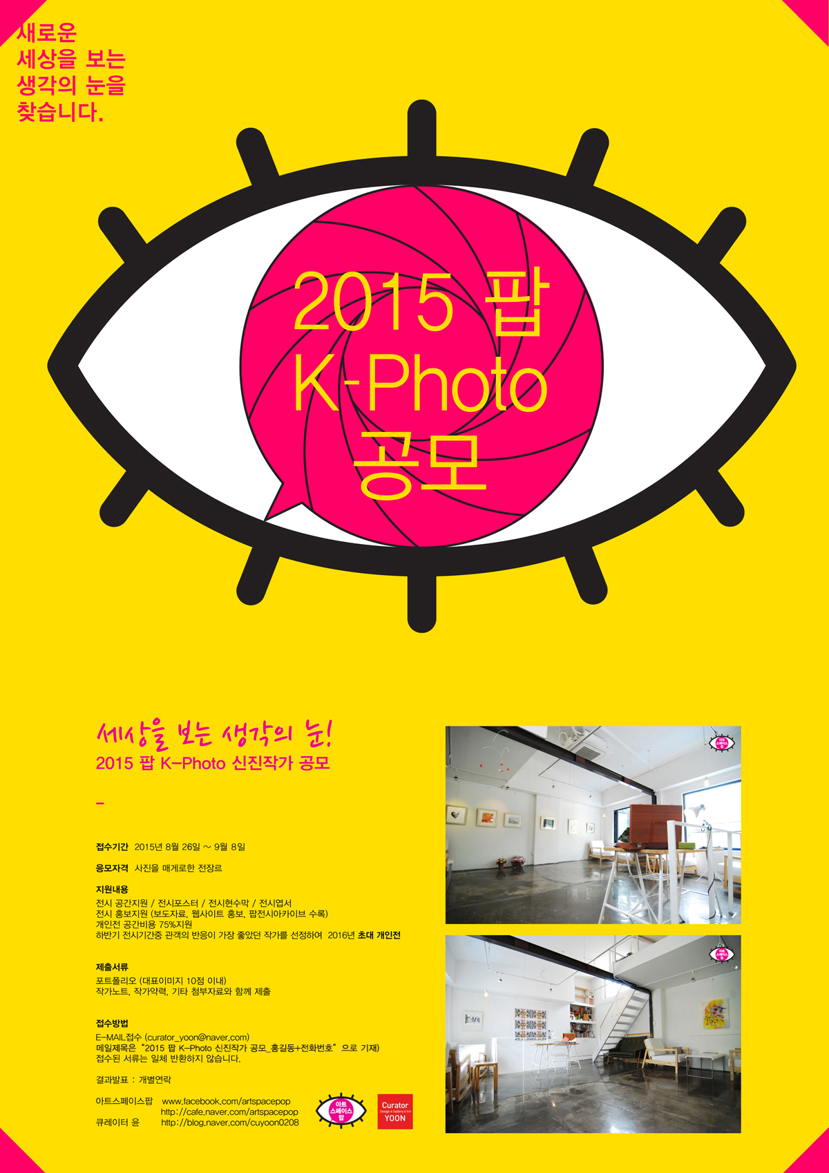 - 메일제목은“2015 팝 K-Photo 신진작가 공모_홍길동+전화번호”으로 기재)