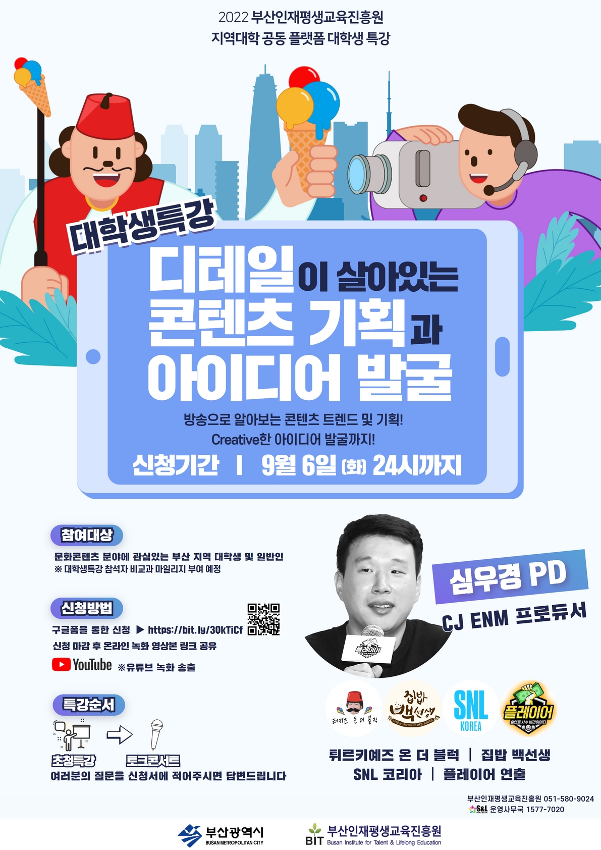 부산인재평생교육진흥원에서 지역 대학 대학생들을 위한 Creative한 특강이 여러분을 기다립니다!요즘 가장 '핫' 한 프로그램, 튀르키예즈 온더 블럭과 SNL코리아 등 대학생들의 마음을 사로잡는 다양한 프로그램을 연출하신 심우경 PD가 부산으로 오십니다!
