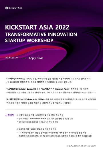 * 해당 프로그램 관련 문의시, 메일 제목에 [킥스타트아시아2022, 문의] 표기하여 주시기 바랍니다.