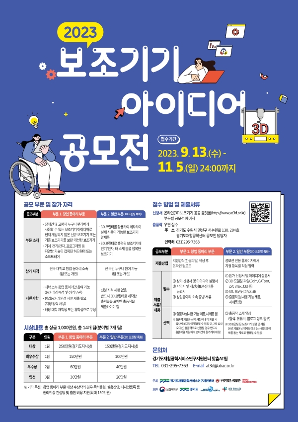 - 주소: 경기도 수원시 권선구 서수원로 130, 204호(경기도재활공학센터), 공모전 담당자