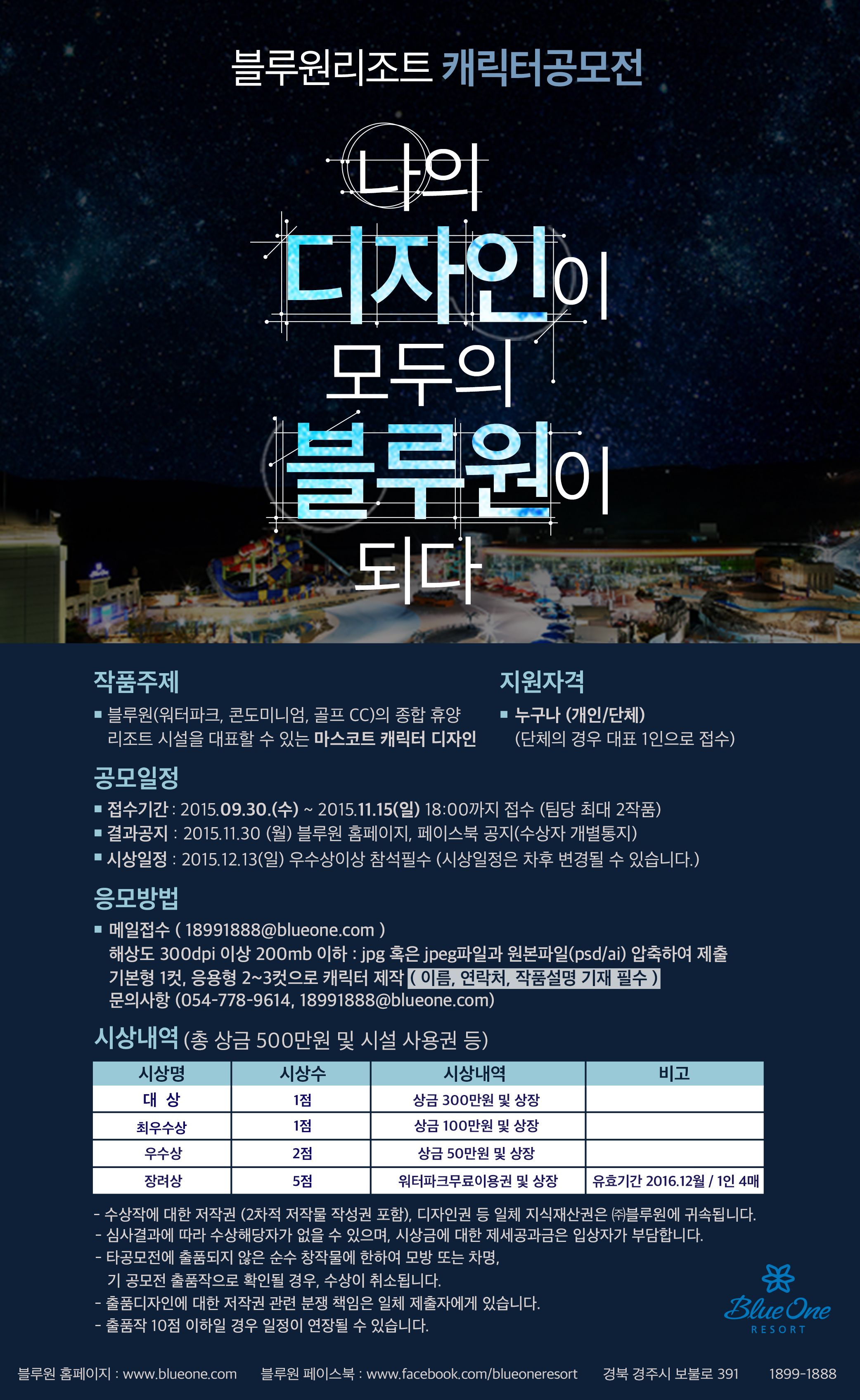 - 결과공지 : 2015.11.30(월) 블루원 홈페이지, 페이스북 공지 (수상자 개별공지)