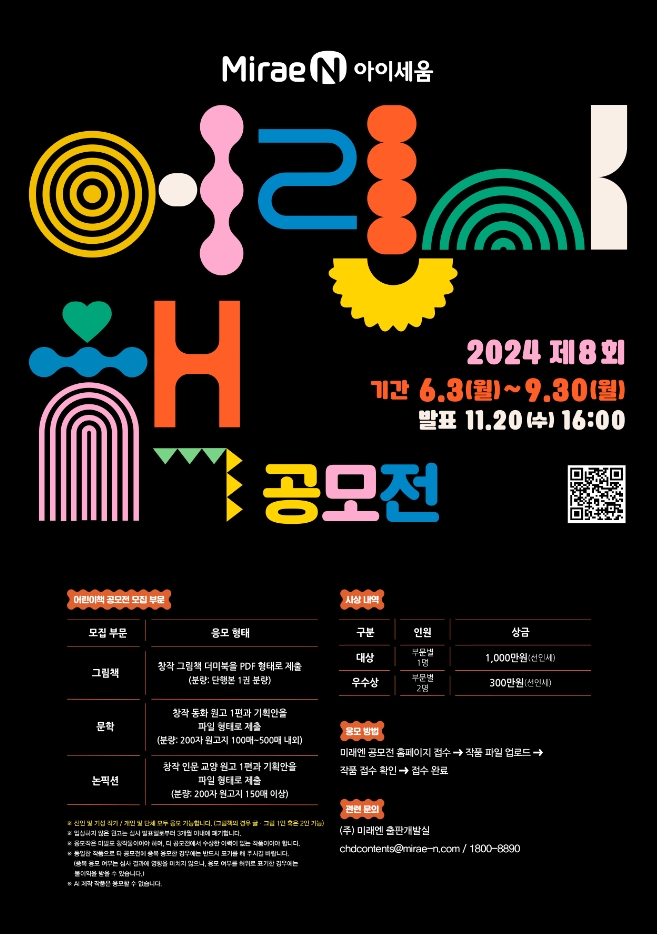 * 유의사항 : ※ 신인 및 기성 작가 / 개인 및 단체 모두 응모 가능합니다. (그림책의 경우 글/그림 1인 혹은 2인 가능)※ 입상하지 않은 원고는 심사 발표일로부터 3개월 이내에 폐기합니다.※ 응모작은 미발표 창작물이어야 하며, 타 공모전에서 수상한 이력이 없는 작품이어야 합니다.※ 동일한 작품으로 타 공모전에 중복 응모한 경우에는 반드시 표기를 해 주시길 바랍니다. (중복 응모 여부는 심사 결과에 영향을 미치지 않으나, 응모 여부를 허위로 표기한 경우에는 불이익을 받을 수 있습니다.)※ AI 제작 작품은 응모할 수 없습니다.