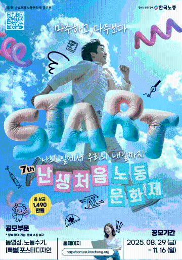 “변화의 시대를 마주하며 노동을 다시 바라봅니다. 그리고 함께 내일을 그려봅니다.”우리 사회 속 노동을 있는 그대로 마주하고, 느끼고, 우리의 언어로 다시 쓰는 노동의 이름.국내 유일의 노동콘텐츠 공모전인 ‘난생처음 노동문화제’는 노동을 가장 나답게 표현할 수 있는 단 하나의 무대가 될 것입니다.