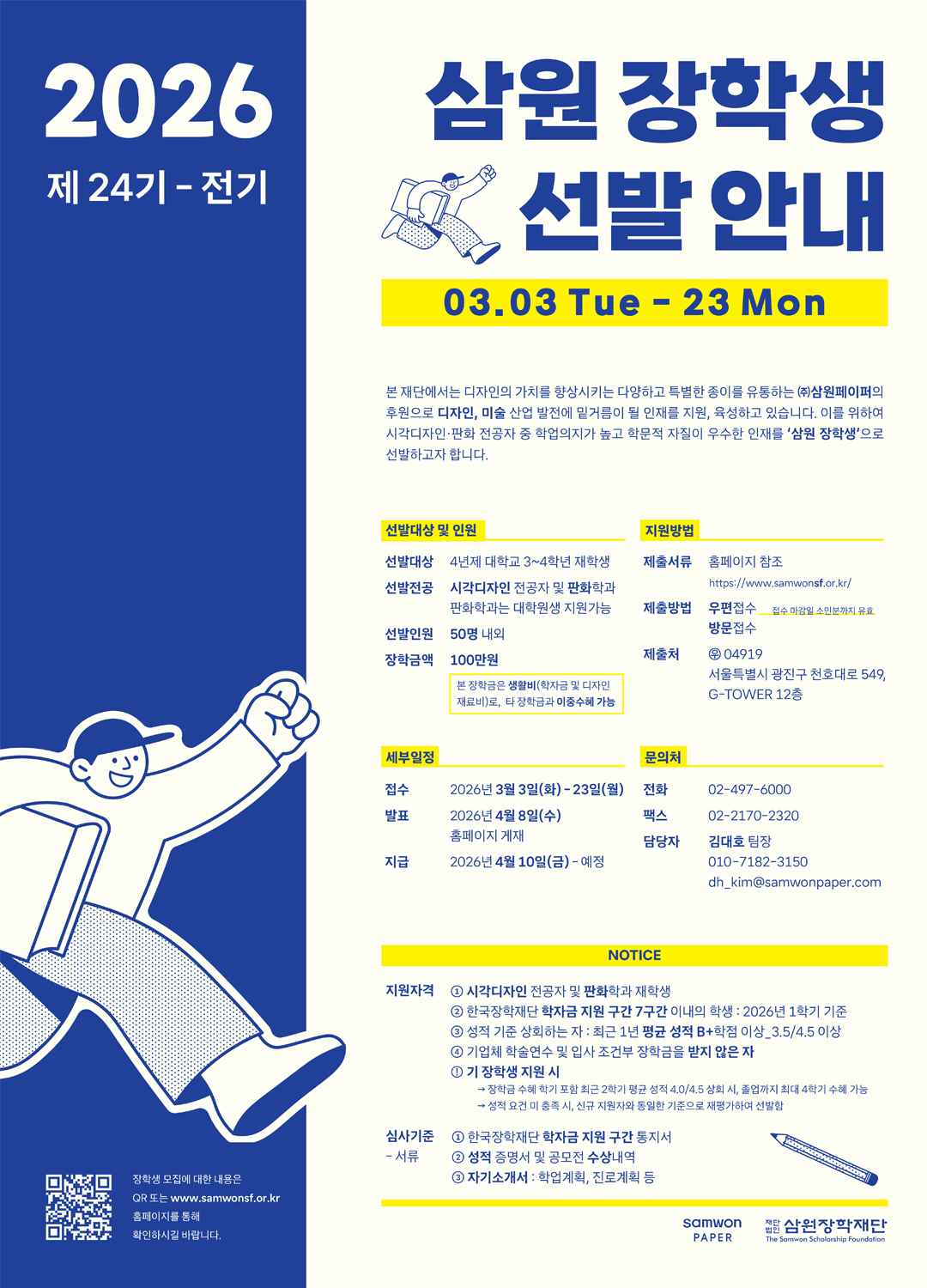 - 방문접수: (04919) 서울시 광진구 천호대로 549, G-TOWER 12층 (재)삼원장학재단 김대호 팀장