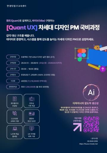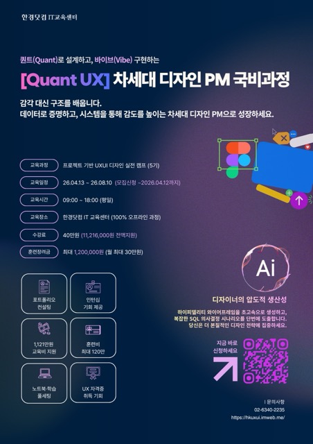 취업성공의 본질은 “내가 잘하는 것”보다 “기업이 원하는 능력”에 집중하는 겁니다.한경닷컴은 철저히 기업이 원하는 니즈를 공략합니다. 오직 한경닷컴에서만 가능한 3가지 차별점!⭕면접관의 눈길을 끄는 압도적인 포트폴리오 (4개월 후, 당신은 '한국경제 뉴스 UI'를 설계한 전문가가 됩니다)⭕홍대 박사 출신 + 글로벌 빅테크 수석이 알려주는 상위 1%가 일하는 방법⭕Quan UX로 감이 아닌 데이터로 디자인하는 초격차 실무 역량이제 ‘디자인 잘하는 사람’만으론 살아남을 수 없습니다.SQL, 데이터 구조, API 이해도를 바탕으로 기획/개발자를 설득할 수 있는 디자이너,왜 이렇게 디자인했어요?라는 질문에 “예뻐서요”가 아닌 데이터로 답할 수 있는 디자이너,한국경제 플랫폼을 실제로 다뤄보며 현직자 수준의 실무경험을 해본 디자이너,한경닷컴에서 지금 도전하세요!● 기간 및 일정