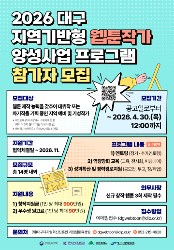 게임웹툰센터 사업담당자(T. 053-215-4920 / E. dgwebtoon@dip.or.kr)