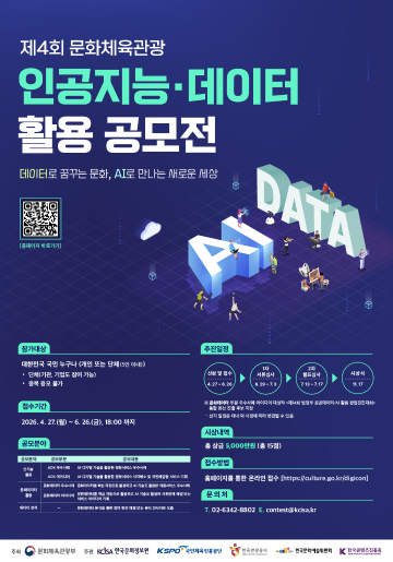 우리 문화 생태계의 경쟁력을 높이고 새로운 활력을 불어넣을 「문화체육관광 인공지능·데이터 활용 공모전」을 개최합니다. 본 공모전은 제13회 범정부 공공데이터 활용 창업경진대회에서 '대통령상' 수상팀을 배출하며 그 저력을 입증했습니다. 기술과 문화의 융합으로 미래를 설계할 여러분의 창의적인 도전을 기다립니다.
