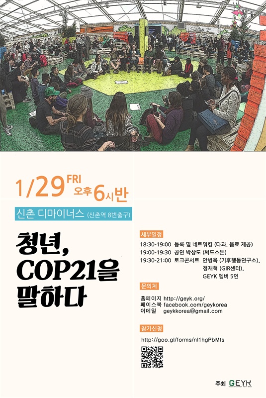 기후변화청년단체(GEYK)에서는 지난해 파리에서 열린 21차 기후변화 당사국총회(COP21)에 참여해 청년들과 함께 회의에서 논의된 결과와 경험를 공유하고, 안병옥소장님(기후행동연구소), 정재혁연구원님(GIR센터)을 모시고 기후변화 대응에 대한 청년들의 관심을 높이고, 함께 동참할 수 있는 방안을 모색하고자 "청년, COP21을 말하다"라는 주제로 토크콘서트를 개최합니다.