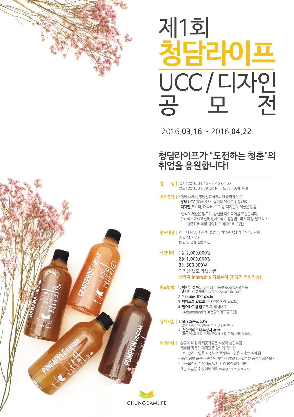 - 청담라이프, 청담발효식초의 대중화를 위한 홍보 UCC(60초 이내, 형식의 제한은 없음) 또는 디자인 (포스터, 캐릭터, 로고 등 디자인의 제한은없음)