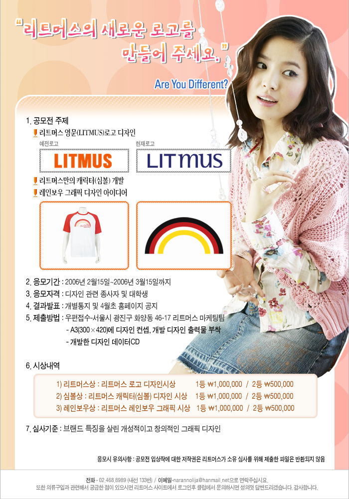 리트머스의 새로운 로고를 만들어주세요 Street Trend를 적극반영한 합리적 가격대의 스타일을 제안하는 유쾌한 브랜드 리트머스에서 이번 시즌 새로운 로고, 심볼, 레인보우 이미지 개발에 관한 공모전을 개최합니다. Fresh한 컬러이미지를 통한 경쾌하고 발랄한 스타일을 제안하는 이번시즌 아이템, 상큼한 이미지의 송혜교와 장난스러운 개구쟁이 이민기의 funny한 story. 다양한 이미지로 표현되는 리트머스만의 새로운 로고와 심볼, 그리고 레인보우 이미지에 관련한 많은 작품들을 기다리고 있습니다. <목 적> 리트머스의 새로운 로고, 심볼, 레인보우 이미지 개발 < 내 용> ㄱ. 공모전 주제 - ①리트머스 영문(LITMUS) 로고 디자인 - ②리트머스만의 캐릭터(심볼)개발 - ③레인보우 그래픽 아이디어 ㄴ. 응모기간 : 2006년 2월 15일부터 3월 15일까지 ㄷ. 결과발표 : 개별통지 및 4월초 홈페이지 공지 ㄹ. 제출방법 : 우편접수 - 서울시 광진구 화양동 46-17 리트머스 마케팅팀 - A3(300*420)에 디자인컨셉, 개발 디자인 출력물 부착 개발한 디자인 데이터 CD ㅁ. 시상내역 ①리트머스상 : 리트머스 로고 디자인 시상 1등 - \ 1,000,000 / 2등 - \ 500,000 ②심 볼 상 : 리트머스 캐릭터(심볼) 디자인 시상 1등 - \ 1,000,000 / 2등 - \ 500,000 ③레인보우상 : 리트머스 레인보우 그래픽 시상 1등 - \ 1,000,000 / 2등 - \ 500,000 ㅂ. 문의 - 리트머스 홍보팀 468-8989, www.fashionlitmus.co.kr ㅅ. 주의사항 - 출품작은 국내외 미 발표작에 한합니다. - 타 공모전 입상작, 표절작은 입상을 취소합니다. - 출품작의 저작권은 리트머스로 귀속됩니다.