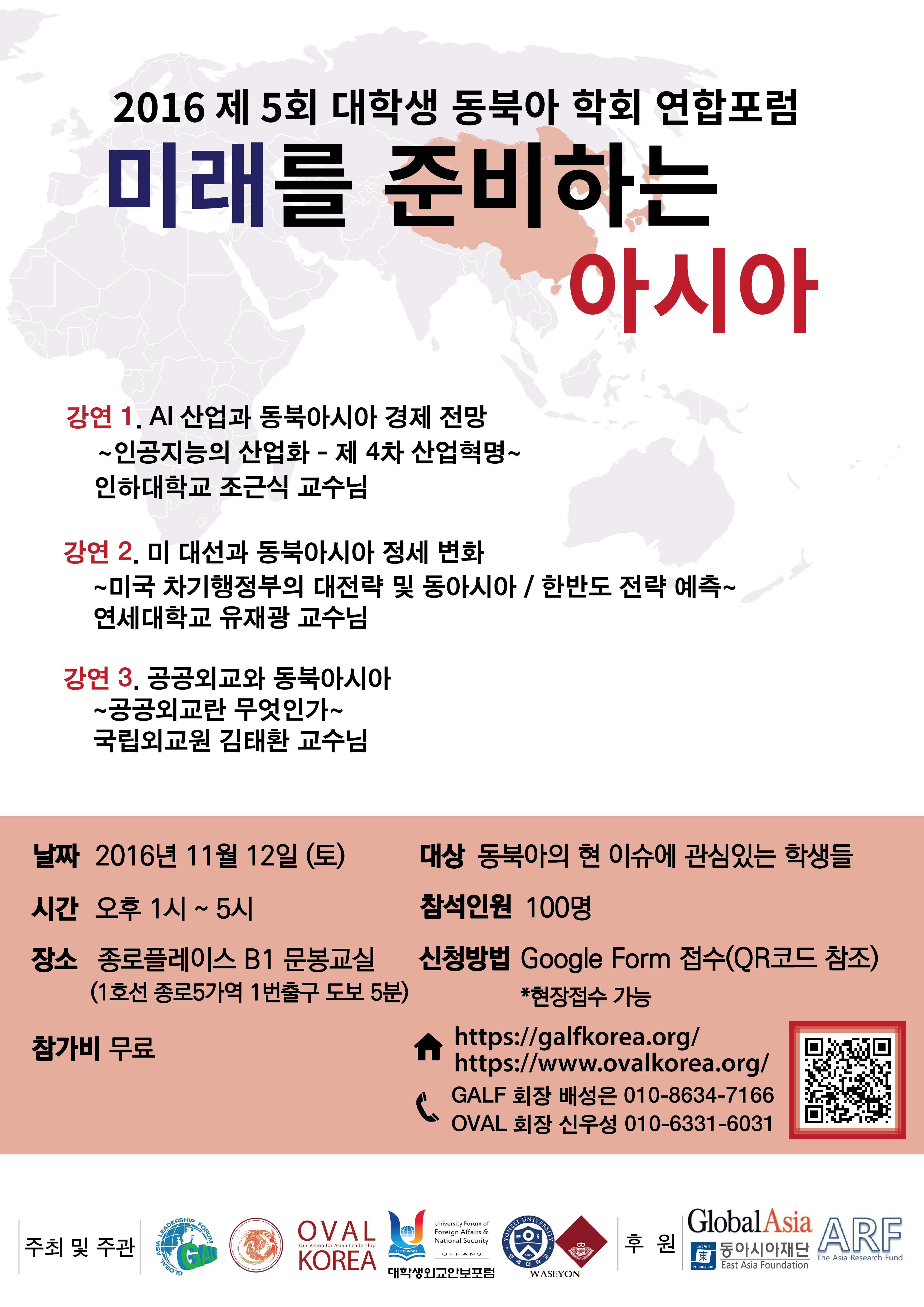 사드배치, 알파고, 미국 대선 등 올 한해 뜨거운 감자였던 이슈들과 동북아시아 외교정세와 경제현황 등에 관심이 있으신 대학생분들을 위해 GALF, 유판스, 와세연, 그리고 오발 코리아가 제5회 연합포럼을 진행합니다.