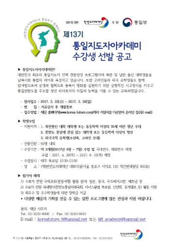 - 통일지도자아카데미란? 대한민국 최초의 통일지도자 인력 전문양성 프로그램이며 북한 및 남한 출신 대학생들을 남북사회 통합의 리더로 육성하고 있습니다. 또한 고려인들과 외국 유학생들도 함께 참여함으로써 공생과 협력으로 동북아 평화를 실현하기 위한 균형적인 사고방식을 키우고 통일한반도를 주도할 청년 리더로서의 자질과 능력을 기를 수 있는 교육과정입니다.