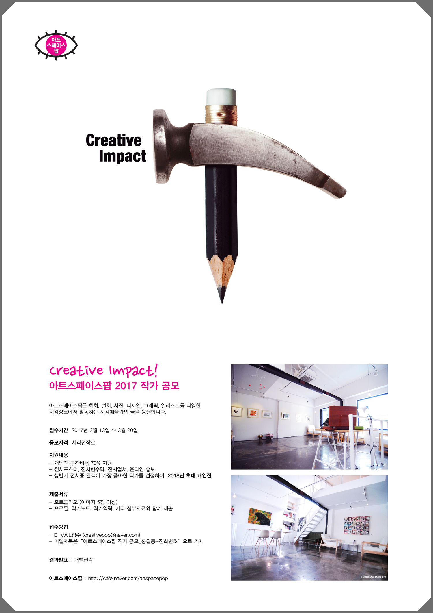 - 아트스페이스팝 2017 작가 공모 아트스페이스팝은 사진, 디자인, 그래픽, 일러스트, 회화, 설치 등 다양한 시각장르에서 활동하는 시각예술가의 꿈을 응원합니다.