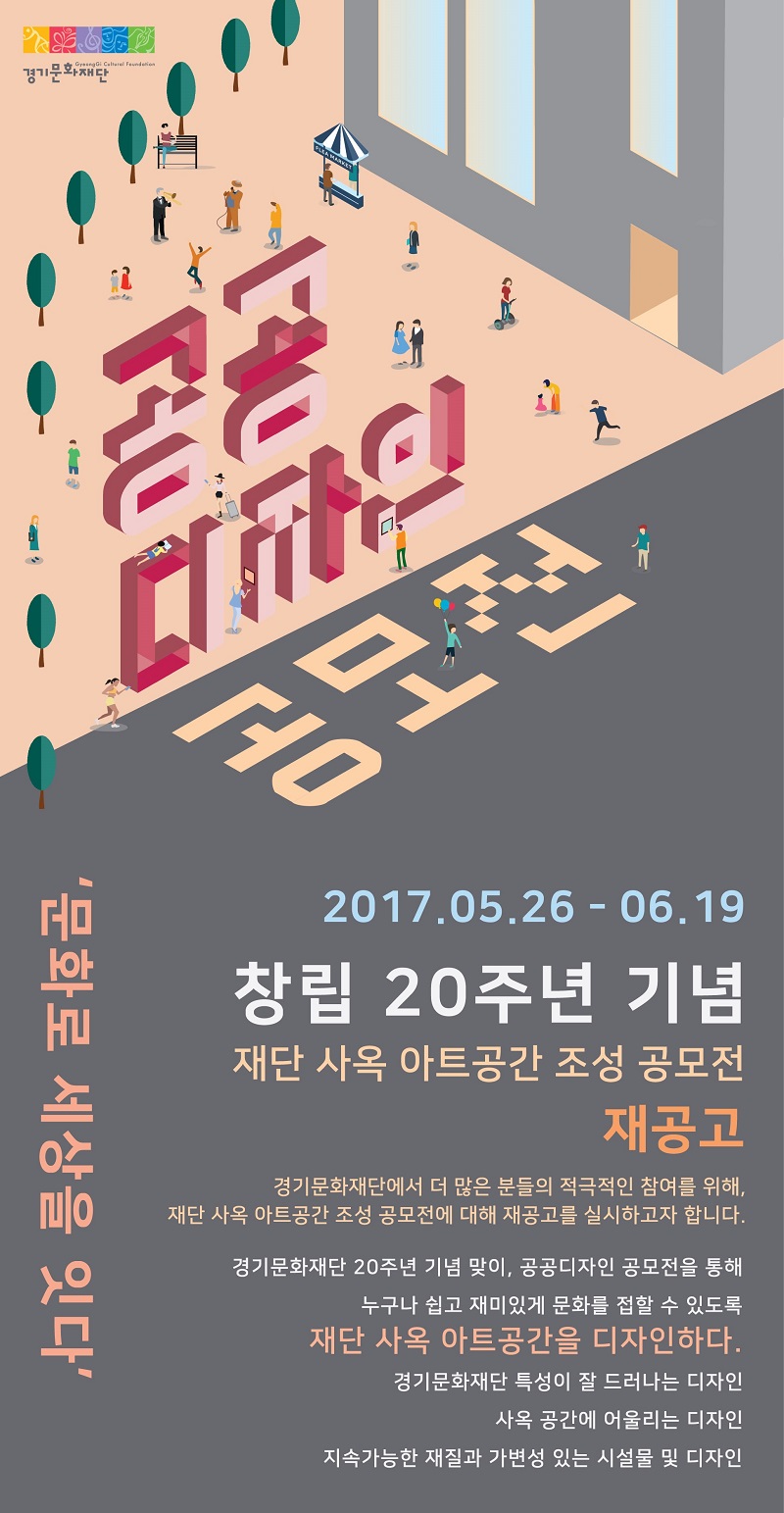 경기문화재단 창립20주년 기념 재단 사옥 아트공간 조성 공모전 (재공고) 경기문화재단에서 더 많은 분들의 적극적인 참여를 위해, 재단 사옥 아트공간 조성 공모전에 대해 재공고를 실시하고자 합니다. 경기문화재단 20주년 기념 맞이 공공디자인 공모전을 통해 누구나 쉽고 재미있게 문화를 접할 수 있도록 재단 사옥에 아트공간을 디자인하고자 합니다. 많은 분들의 관심과 참여 바랍니다.