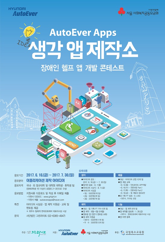 - 장애인 헬프 앱 개발 콘테스트는 현대오토에에버 및 서울사회복지공동모금회 지원으로 운영되는 사회공헌사업으로 장애·비장애 대학생 아이디어 공모와 장애인 앱 개발 지원을 통해 장애인 스마트폰 사용환경을 개선하는 프로그램입니다.