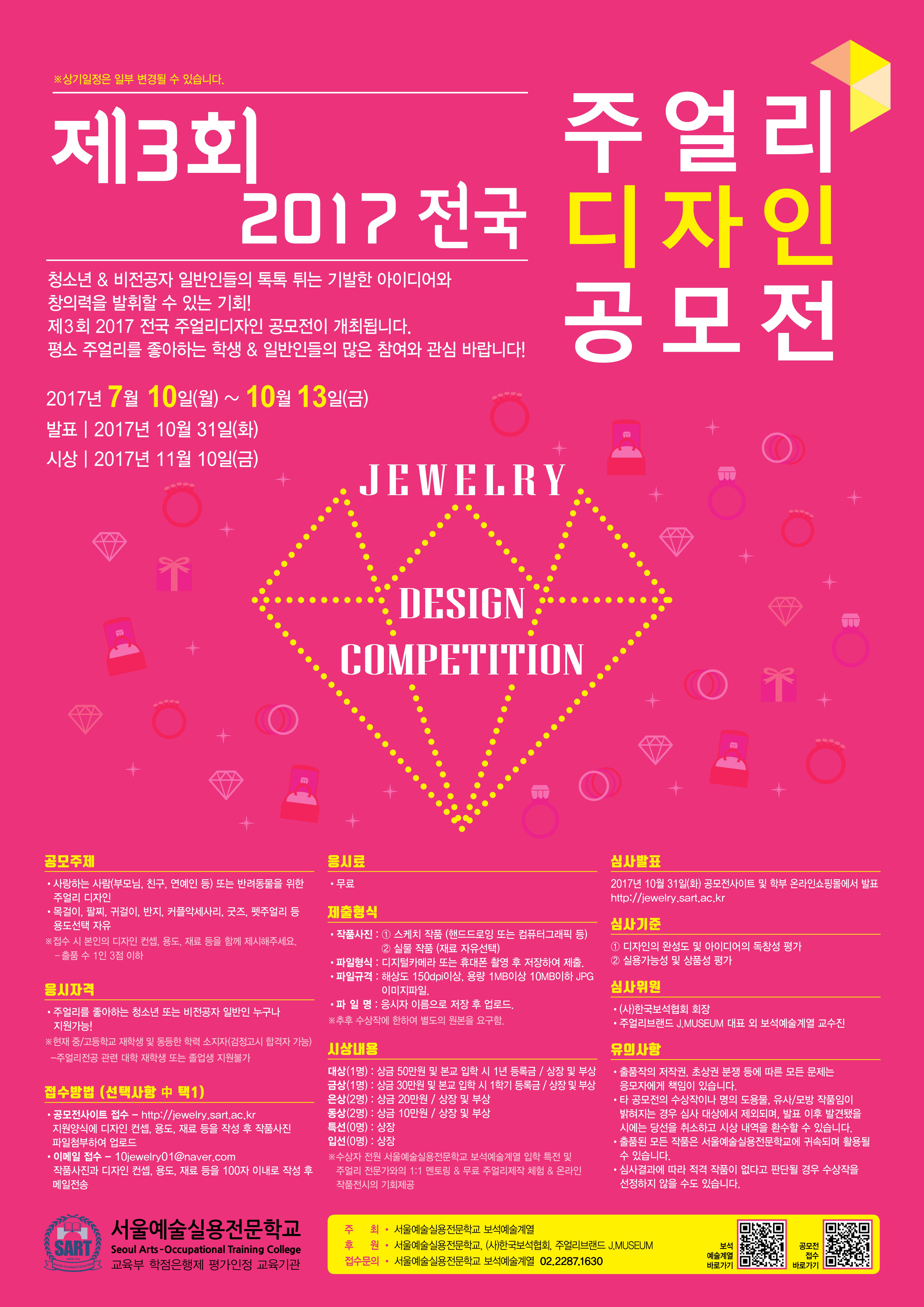 - 청소년 & 비전공자 일반인들의 톡톡 튀는 기발한 아이디어와 창의력을 발휘할 수 있는 기회! 제 3 회 2017 전국 주얼리디자인 공모전이 개최됩니다. 평소 주얼리를 좋아하는 학생 & 일반인들의 많은 참여와 관심 바랍니다!