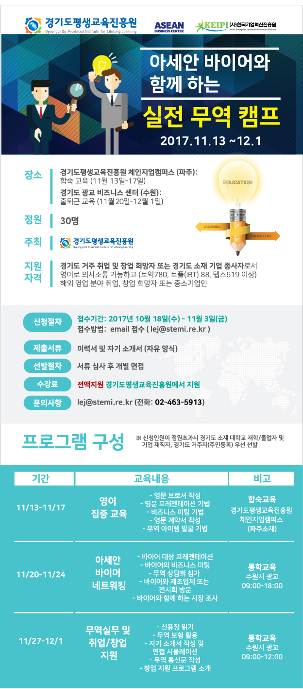 - 경기평생교육진흥원(구 파주영어마을) 체인지업캠퍼스와 아세안비즈니스컨설팅 센터에서는 국내 청년 실업률 해소 및 취업역량을 강화하고자 프로젝트형 영어교육캠프 교육생을 모집하고 있습니다.