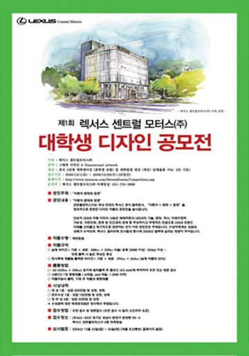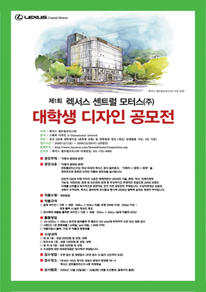 제1회 렉서스 센트럴모터스㈜ 대학생 디자인 공모전 주 최 : 렉서스 센트럴모터스㈜ 분 야 : 그래픽 디자인 2-dimentional artwork 대 상 : 전국 2년제 대학생이상 (휴학생 포함) 및 대학원생(박사과정 제외) 대상 접수기간 : 2006/12/1(금) ~ 2006/12/20(수) (20일간) 홈페이지 : http://www.lexuscm.com/news&events 문의처 : 렉서스 센트럴모터스㈜ 마케팅실: 031-705-9868 ■ 공모주제 : “자동차 문화와 환경” ■ 공모자격 : 전국 2년제 대학생이상 (휴학생 포함) 및 대학원생(박사과정 제외) 대상 (개인/ 단체출품 가능: 2인 기준) ■ 공모내용 : “자동차 문화와 환경” 센트럴모터스㈜는 국내 최대의 렉서스 공식 딜러로서, “자동차 + 문화 + 환경”을 창의적으로 표현한 디자인 작품의 공모전을 실시합니다. 단순한 lexus 차량 이미지 사용은 배제하면서 lexus의 기술, 문화, 역사, 미래지향적 가능성, 자연친화, 환경 및 인간과의 관계 등 추상적이고 무형적인 컨셉으로 lexus 브랜드 자체를 신비롭고 획기적으로 표현하는 것이 이번 공모전의 주제입니다. 수상작에게는 상금과 상패가 수여되며, 렉서스 갤러리에 전시됨과 동시에 2008년 달력에 실리는 영광이 주어집니다. ■ 작품수량 : 제한없음 ■ 작품규격 ○ 실제 싸이즈> 가로 × 세로: 588㎜ × 528㎜ 비율/ 용량 30mb 이상/ 30dpi 이상 – 대형 출력 시 높은 해상도 중요 ○ 회사측에 제출할 출력본 싸이즈> 가로 × 세로: 294㎜ × 264㎜ (실제 작품의 50%) ■ 출품방법 ○ a3 (420㎜ × 300㎜) 용지에 칼라출력 후 폼보드 (a3 size)에 부착하여 우편 또는 방문 접수. ○ 사본cd 1장 동봉제출 ( ai파일, psd 파일, 1.5mb 이하) ○ 작품지원서 출력, 기재 후 폼보드 (a3 size) 뒷면에 부착하여 제출. ■ 시상내역 ○ 대 상 1점 : 상금 200만원 및 상장, 상패 ○ 최우수상 1점 : 상금 100만원 및 상장, 상패 ○ 장 려 상 3점 : 상금 30만원 및 상장 ※ 수상금에 대한 제세공과금은 당사에서 부담입니다. ■ 접수기간 : 2006/12/1(금) ~ 2006/12/20(수) ■ 접수방법 : 우편 접수 및 방문접수 (우편 접수 시 일자 소인까지 유효) ■ 접수장소 : (우463-832) 경기도 성남시 분당구 분당동 98-4 렉서스 센트럴모터스㈜ 4층 마케팅실 ■ 오시는 길 : 홈페이지를 참조하세요. (www.lexuscm.com) ■ 심사발표 : 2006년 12월 22일(금) (개별 유선통보/ 홈페이지 발표) ■ 시 상 식 : 2006년 12월 26일(화) (시간/장소 개별 유선통보/ 홈페이지 공지) ■ 전 시 : 분당동 렉서스 센트럴모터스㈜ 5층 lexus exclusive zone, “central for u” ■ 문 의 : 분당 렉서스 센트럴모터스㈜ 마케팅실 (031-705-9868) ■ 기 타 ○ 공모 당선작에 대한 저작권 및 특허, 실용신안, 의장등록 등 일체의 권리는 센트럴모터스㈜에 귀속됨 ○ 유사작품 타공모 시, 모방시 박탈되며, 사후 발견 시 수상 취소 및 상금환수 조치 ○ 작품질에 따라 입상작이 없을 수도 있음 ○ 낙선작은 결과발표 1개월간 접수처서 반환