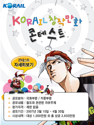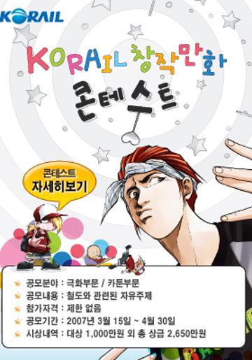한국철도공사와 한국만화가협회가 함께하는 ‘KORAIL 창작만화 콘테스트' 4월 ‘KTX 개통 3주년과 이용객 1억명 돌파'기념으로 진행되는 이번 공모전은 철도저변 확대를 위한 철도문화콘텐츠개발과 유능한 작가 발굴을 위한 문화마케팅사업으로 한국철도공사와 (사)한국만화가협회가 공동 주관하여 아래와 같이 시행하오니 철도와 만화를 사랑하는 많은 분들의 적극적인 관심과 참여를 바랍니다. □ 공모전 개요 ○ 공모분야 : 극화부문 / 카툰부문 ○ 공모내용 - 철도와 관련된 자유주제 (사회규범을 손상시키지 않는 작품) - 타 공모전에 수상경력이 없는 순수 창작물 ○ 참가자격 : 제한 없음 (1팀 2인 이내) ○ 공모 기간 : 2007년 3월 15일 ~ 4월 30일 ○ 시상내역 대상 : 극화(1000만원), 카툰(700만원) 외 8개 부문 총 상금 2650만원 (세부사항 홈페이지참조) ※ 특전 - 수상자는 허영만 등 유명 만화가가 참여하는 철도연작 만화제작에 참여 가능 - 철도연작 만화제작에 참여하는 수상자는 (사)한국만화가협회 정식회원으로 등록 기회 부여 ○ 주최 : 한국철도공사 ○ 주관 : 한국철도공사, (사)한국만화가협회 ○ 후원 : 한국문화콘텐츠진흥원, (재)부천만화정보센터, SBA 서울애니메이션센터, SICAF, (사)우리만화연대, 한국여성만화가협회, 한국카툰협회, 한국스토리작가협회, 코믹타운 ○ 협찬 : 코레일네트웍스, KTX관광레저, TrainShop, 데일리줌, 홈플러스, 녹색지팡이 □ 작품 접수 및 반환 ○ 접수기간 : 2007년 4월 16일 ~ 4월 30일 18시까지 (토, 일요일 제외) ○ 제출물 - 공모전 신청서 1부 (양식 다운로드) ※ 2개 이상 또는 2부문 이상의 신청시 작품 당 1부씩 제출 - 작품 원본 ※ 디지털작업물일 경우 작품 출력물(출력크기 A4, 해상도 300dpi, 컬러 작품일 경우 컬러 출력물) 및 작품 원본 디지털 파일(해상도 300dpi) ※ 스크롤만화의 출력물은 세로크기가 2500 픽셀(출력 해상도 300dpi 기준)을 넘지 않도록 분할 출력 ○ 작품규격 - 수작업 작품 규격 : A4(210×297㎜) ~ A3(297×420㎜) - 디지털작업 작품 규격 : A4(210×297㎜) ~ A3(297㎜×420㎜), 해상도 300dpi ※ 스크롤만화로 제작했을 경우 가로크기 A4(210㎜) ~ A3(297㎜), 세로크기 제한 없음, 해상도 300dpi ○ 작품분량 - 극화부분 : 16쪽 이상 원고 - 카툰부분 : 1~4컷 작품 5점 이상 ○ 접수방법 - 우편 및 방문접수 : 서울시 중구 예장동 8-20 만화의집 1층 (100-250) (사)한국만화가협회(당일 소인 유효) - 이메일접수 : tkyou7567@paran.com - 웹하드접수 : http://www.webhard.co.kr (ID : ccctoon, PW : 8485, 올리기전용>KORAIL공모전폴더) ※ 이메일 및 웹하드접수 후에는 반드시 담당자에게 연락을 주시기 바람 ※ 이메일 및 웹하드로 우선 접수했을 경우 반드시 작품 원본(또는 작품 출력물)을 제출해야 접수 완료됨 ○ 반 환 - 낙선작은 지원작 발표 후 반환 ※ 반환 수령은 공모 종결 후 1개월 이내 직접 수령 또는 반송 우편환 동봉 접수시 우편 반환 □ 심사 및 결과 발표 ○ 심사기간 : 2007년 5월 1일 ~ 5월 18일 ○ 심사방법 - 1차 예비심사, 2차 온라인 고객심사, 3차 전문가심사를 통한 3단계 심사 ※ 심사위원은 관련분야 전문가와 한국철도공사 담당자로 구성 ※ 온라인 고객심사는 선호도 조사로 3차 전문가심사의 참고자료로 활용되며 상위 선호작에 대해서는 별도 시상 예정 ○ 발표일자 : 2007년 5월 21일(월) 예정(추후 변동 가능) ○ 결과발표 : 한국철도공사, 한국만화가협회, 코믹타운 홈페이지 공고 및 수상자 개별 통보 □ 시상 및 수상작 전시회 ○ 시상일자 및 장소 : 결과발표시 공지 ○ 전시일자 및 장소 : 결과발표시 공지 □ 문의 ○ 담당자 : 한국만화가협회 ‘KORAIL 창작만화 콘테스트' 담당자 최윤미 ○ 연락처 : (02)757-8485 ○ 이메일 : tkyou7567@paran.com □ 응모규정 ○ 수상작의 저작권은 한국철도공사에 귀속됨 ○ 작품반송을 원할 경우 우편접수시에는 우편환(5,000원)을 동봉하여야 하며 방문접수 시에는 추후 공고하는 방법과 일정에 따라 반환함 ○ 주최/주관 측은 접수·반환에 따른 작품훼손에 대한 책임을 지지 않음 ○ 국·내외 기존 작품을 표절 또는 모방한 작품 및 타 공모전 수상기록이 있는 작품은 심사에서 제외되며, 선정 후 판명되거나 결격사유가 발생할 경우 입상 취소 및 법적 모든 책임은 응모자에게 있음 ○ 심사결과에 따라 해당작이 없을 경우 시상하지 않으며, 수상작으로 선정시 입상 취소 요청은 받아들여지지 않음
