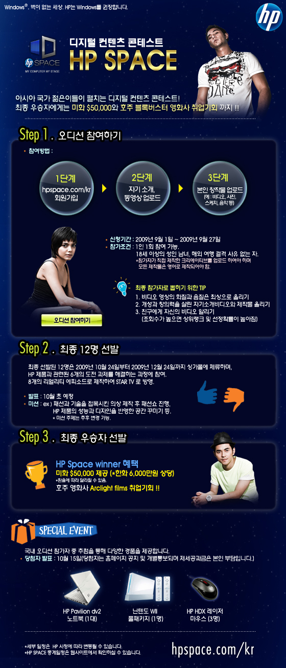 오디션에 참여하기 위해서는 자기소개 동영상 및 창의적인 제작물을 웹사이트(www.hpspace.com/kr)에 업로드 해야하며 총 12명의 선발자가 space 프로그램에 참여하게 됩니다. 최종 우승자에게는 미화 5만불의 상금과 호주 블록버스터 영화사 “arclight films” 로의 취업 기회까지 제공합니다.