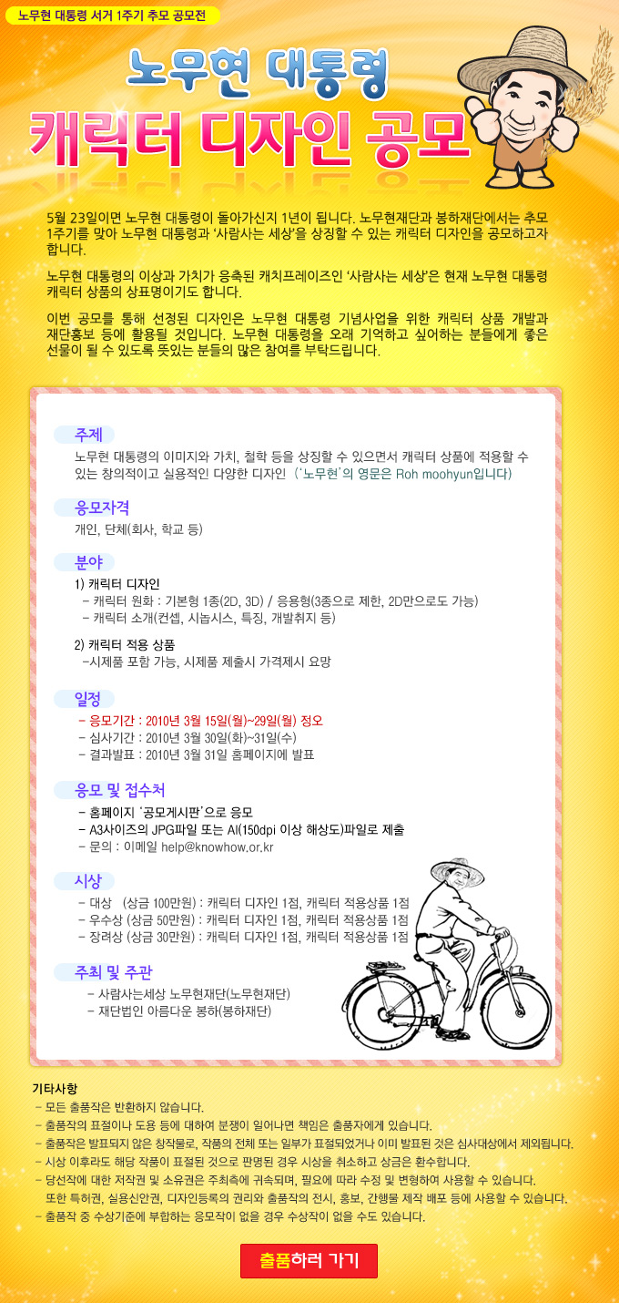 5월 23일이면 노무현 대통령이 돌아가신지 1년이 됩니다. 노무현재단과 봉하재단에서는 추모 1주기를 맞아 노무현 대통령과 ‘사람사는 세상’을 상징할 수 있는 캐릭터 디자인을 공모하고자 합니다.