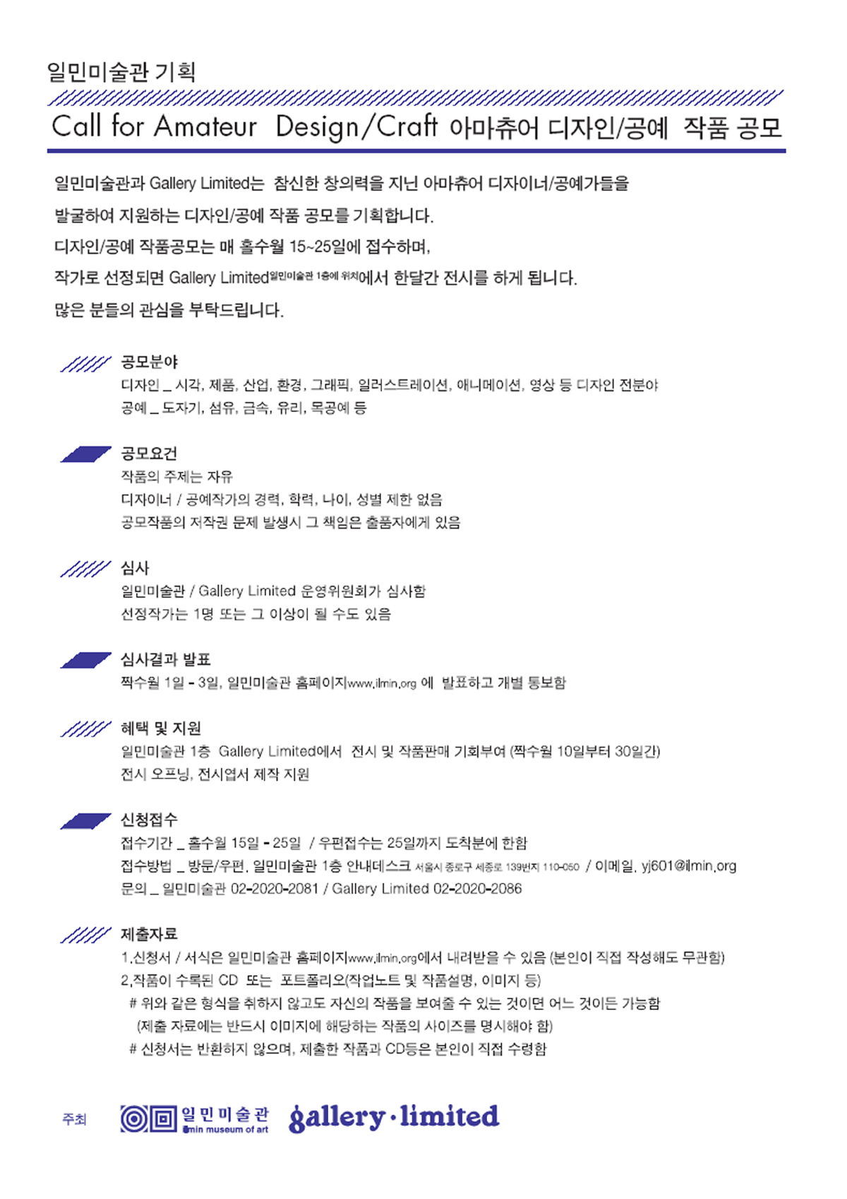 일민미술관과 Gallery Limited는 참신한 창의력을 지닌 아마추어 디자이너/공예가들을 발굴하여 지원하는 디자인/공예 작품 공모를 기획합니다.
