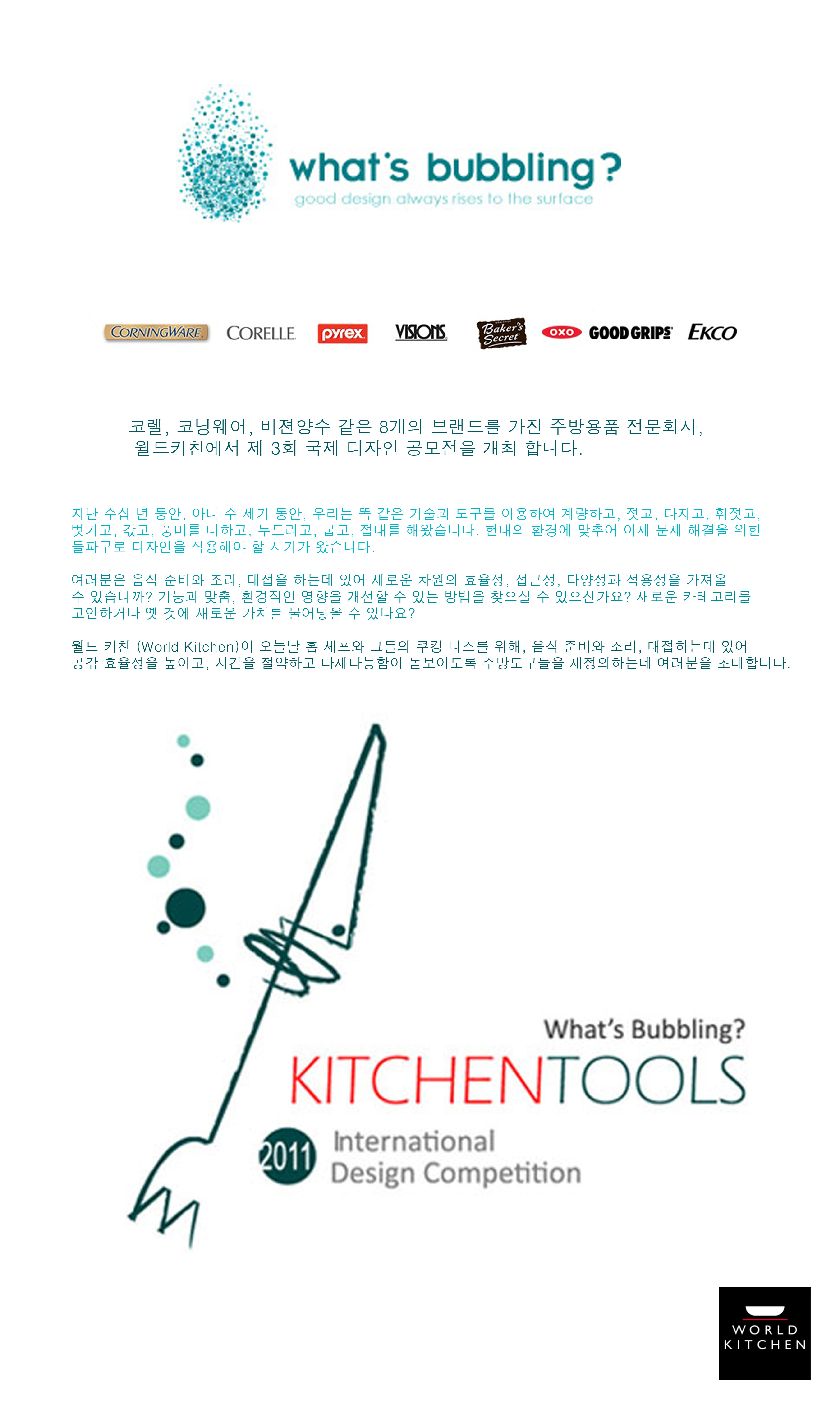 목적 & 2011 주제: 월드 키친은, 가정용품 산업의 핵심적인 가치로서의 디자인의 역할을 설명해줄 수 있는 혁신적인 사고와 문제 해결에 박차를 가하고 있습니다. 금년 월드 키친의 What’s Bubbling? 국제 디자인 경연 대회에서는 오늘날 음식의 역할 및 그 준비과정과 이에 따르는 즐거움을 탐구하고, 널리 알리고자 합니다.