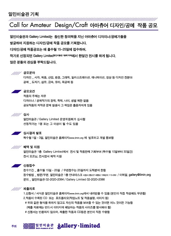 일민미술관과 Gallery Limited는 참신한 창의력을 지닌 아마추어 디자이너/공예가들을 발굴하여 지원하는 디자인/공예 작품 공모를 기획합니다.