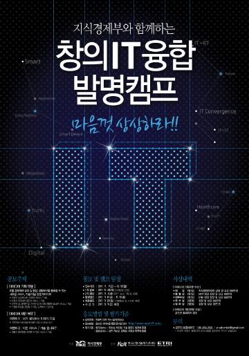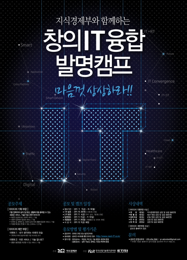 ● 공모개요 - 지식경제부와 함께하는 창의IT융합 발명캠프 공모전을 개최합니다. 창의IT 캠프를 통해 미래 융합기술/서비스 Item을 전략적으로 발굴하고, 이를 통해 산업원천융합기술 등 R& D 기획을 위한 RFP 도출 ● 접수기간 및 일정 - 접수기간 : 2011년 9월 9일(금) ~ 10월 10일(월) - 발명캠프 : 2011년 11월 11일(금) ~ 11월 13일(일) - 시상식 : 2011년 12월 9일(금) 예정 ● 심사발표 - 1차 발표 : 2011년 10월 20일(목) (14명/팀 선정) - 2차 발표 : 2011년 11월 4일(금) (PPT 심사, 7명/팀 선정) - 최종발표 : 2011년 11월 28일(월) (개별통보 및 사이트 게재) ● 참가자격 - 전국민 (개인 또는 팀/5인이하) ● 공모주제 [아이디어 기획 부문] ※ IT를 접목하여 삶의 질 향상, 생활욕구를 충족할 수 있는 새로운 서비스, 기술(기능) 관련 아이디어 - 마음껏 상상해 보는 미래의 서비스/기술 - 사용자 입장엣 필요한 서비스/기술 - 안전한 삶, 쾌적한 삶, 건강한 삶 등 미래 생활에 필요한 서비스/기술 - IT융합 확산을 견인할 수 있는 신서비스/신기술 [아이디어 제안부문] [EVENT 1] 내가 생각하는 미래의 모습 - ' 2025년 미래 모습' 에 대한 가상 시나리오 쓰기 - 분량 자유 [EVENT 2] 이런서비스/기술 없나요? - 생활의 불편함을 개선할 수 있는 서비스/기술 - 500자 이내 ● 심사기준 [평가기준] - 창의성(70%) : 독창성, 혁신성, 기술 융합도 측면에 중점 - 실용성(30%) : 실현 가능성, 경제성, 시장성 측면에 중점 ● 응모방법 - 공모전 사이틀르 통한 온라인 접수 (http://www.next-it.co.kr/) ● 아이디어 제안형식 ※ 공모 주제와 관련된 아이디어를 자유롭게 올리되, 가능한 아래의 형식을 권장 [아이디어 제목] - 본인이 제안하고자 하는 서비스 또는 기술, 제품의 이름 [아이디어 개요] - 제안 아이디어(명)에 대한 개념, 핵심 내용 (기존 서비스, 기술, 제품과의 차임점 또는 특이형 점 등 강조하고 싶은 내용을 중심으로 기술) [아이디어 내용] - 제안배경 및 현황(발상배경, 관련시장, 선진/유사 사례 등) - 아이디어 세부내용 (관련기술, 목표고객, BM 등) - 산업화 방안 및 기대효과 [아이디어 적용] - 가상도, 시나리오 등 구체적 적용의 예 (글 또는 그림, 동영상 등 어떤 형태로든 표현 가능) ● 문의처 [공모전 운영사무국] - Tel : 070-4156-2501 - E-mail : pr.adcontest@gmail.com● 시상내역 [아이디어 기획 부문] - 대상(1명/팀) : 지식경제부장관 상장 및 상금 500만원 - 특별상(1명/팀) : KEIT 원장 상장 및 상금 300만원 - 최우수상(1명/팀) : ETRI 원장 상장 및 상금 300만원 - 우수상(2명/팀) : 상장 및 상금 200만원 - 장려상(2명/팀) : 상장 및 상금 100만원 ※ 전문가와 공동으로 R& D 기획과정 체험 및 창의IT융합 교육기회 제공 ※ 우수 아이디어에 대해 특허출원 지원(저작권은 주관사와 공동소유) [아이디어 제안부문] EVENT 1 내가 생각하는 미래의 모습 : 4명 - 테블릿PC : 갤럭시탭 10.1, 32G/와이파이 모델 EVENT 2 이런서비스/기술없나요? : 200명 - 4,000원 상당의 스타벅스 모바일 기프트콘