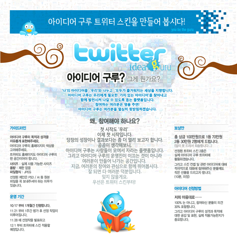트위터 스킨 공모"나보다 똑똑한 우리?" [ ideaguru.kr ]●국내에서 시도되는 아이디어 크라우드 소싱(집단지성)플랫폼인, "아이디어 구루"에서 론칭 기념으로 트위터 스킨 디자인 아이디어를 모으고 있습니다. ●아이디어 구루의 목적과 성격을 자유롭게 표현할 수 있는 디자인을 원하며, 실제 사용 가능한 사이즈를 용량 제한 없이 올려주시면 됩니다. ●진행: 10월 17일 부터 1개월간●보상: 총 상금 100만원 (1등 70만원 / 2등 30만원)프로 디자이너 분들의 많은 참여 바랍니다.
